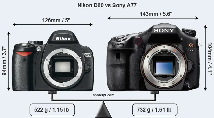 If the front view area (width x height) of the cameras is taken as an aggregate measure of their size, the Sony A77 is notably larger (26 percent) than the Nikon D60. Moreover, the A77 is substantially heavier (40 percent) than the D60. It is noteworthy in this context that the A77 is splash and dust-proof, while the D60 does not feature any corresponding weather-sealing.