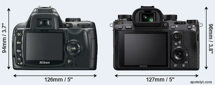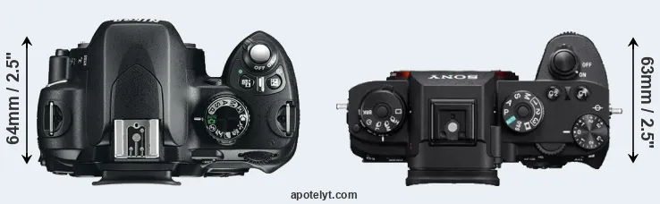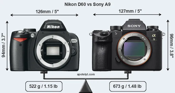 The physical size and weight of the Nikon D60 and the Sony A9 are illustrated in the side-by-side display below. The two cameras are presented according to their relative size. Three successive views from the front, the top, and the rear are shown. All size dimensions are rounded to the nearest millimeter.