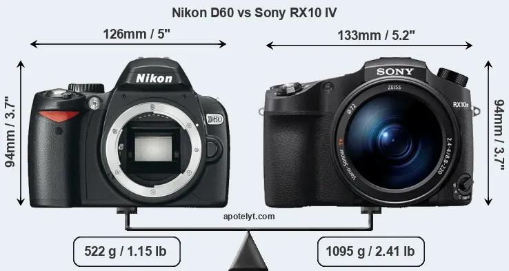 The physical size and weight of the Nikon D60 and the Sony RX10 IV are illustrated in the side-by-side display below. The two cameras are presented according to their relative size. Three successive views from the front, the top, and the rear are shown. All width, height and depth dimensions are rounded to the nearest millimeter.