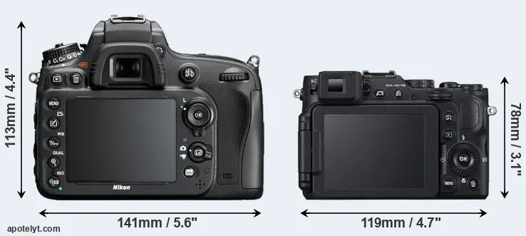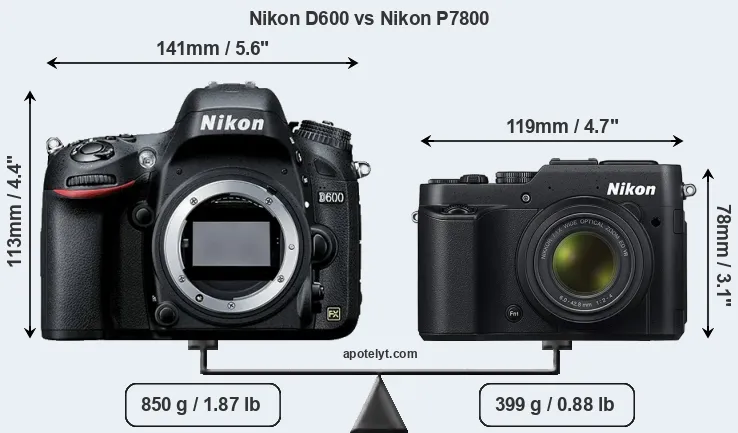 The physical size and weight of the Nikon D600 and the Nikon P7800 are illustrated in the side-by-side display below. The two cameras are presented according to their relative size. Three successive views from the front, the top, and the rear are shown. All width, height and depth dimensions are rounded to the nearest millimeter.