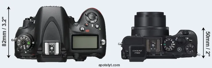 If the front view area (width x height) of the cameras is taken as an aggregate measure of their size, the Nikon P7800 is considerably smaller (42 percent) than the Nikon D600. It is worth mentioning in this context that the D600 is splash and dust resistant, while the P7800 does not feature any corresponding weather-sealing.