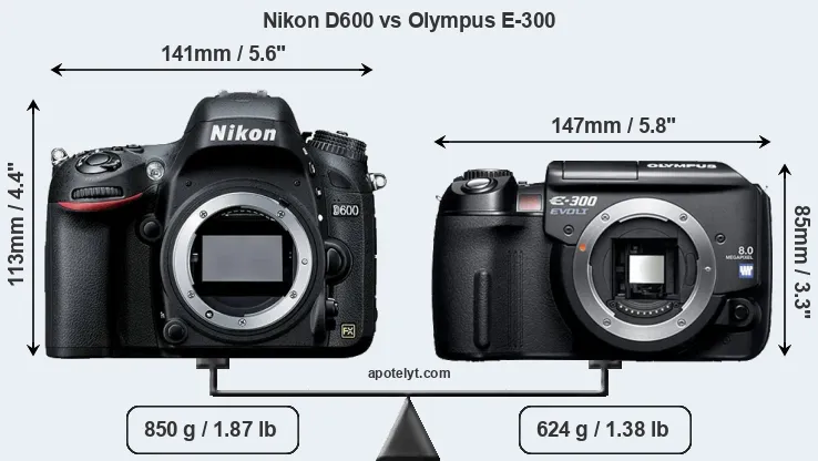 The side-by-side display below illustrates the physical size and weight of the Nikon D600 and the Olympus E-300. The two cameras are presented according to their relative size. Three consecutive views from the front, the top, and the rear side are shown. All width, height and depth measures are rounded to the nearest millimeter.