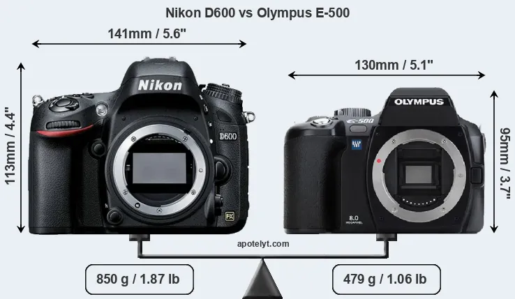 An illustration of the physical size and weight of the Nikon D600 and the Olympus E-500 is provided in the side-by-side display below. The two cameras are presented according to their relative size. Three consecutive views from the front, the top, and the rear side are shown. All width, height and depth measures are rounded to the nearest millimeter.