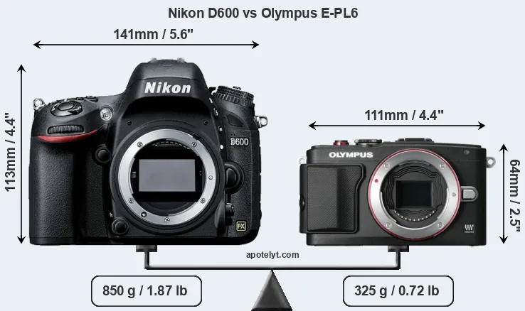 An illustration of the physical size and weight of the Nikon D600 and the Olympus E-PL6 is provided in the side-by-side display below. The two cameras are presented according to their relative size. Three successive views from the front, the top, and the rear are shown. All width, height and depth dimensions are rounded to the nearest millimeter.
