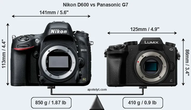 If the front view area (width x height) of the cameras is taken as an aggregate measure of their size, the Panasonic G7 is considerably smaller (33 percent) than the Nikon D600. Moreover, the G7 is substantially lighter (52 percent) than the D600. It is worth mentioning in this context that the D600 is splash and dust resistant, while the G7 does not feature any corresponding weather-sealing.