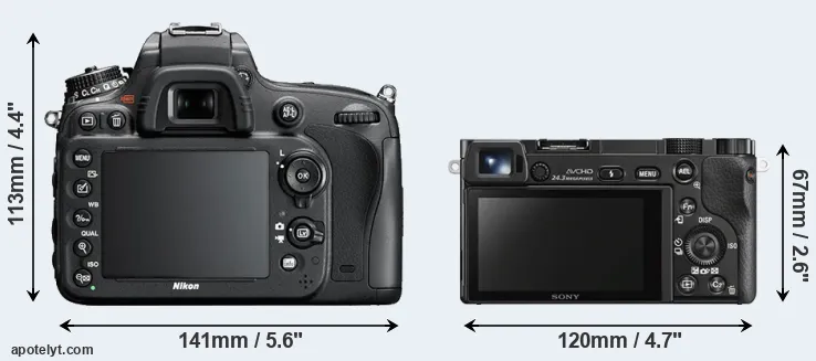 The physical size and weight of the Nikon D600 and the Sony A6000 are illustrated in the side-by-side display below. The two cameras are presented according to their relative size. Three consecutive perspectives from the front, the top, and the back are available. All width, height and depth dimensions are rounded to the nearest millimeter.