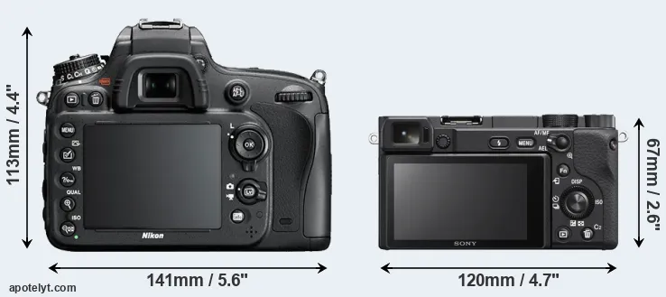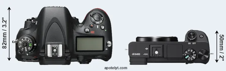 The physical size and weight of the Nikon D600 and the Sony A6400 are illustrated in the side-by-side display below. The two cameras are presented according to their relative size. Three consecutive perspectives from the front, the top, and the back are available. All width, height and depth dimensions are rounded to the nearest millimeter.