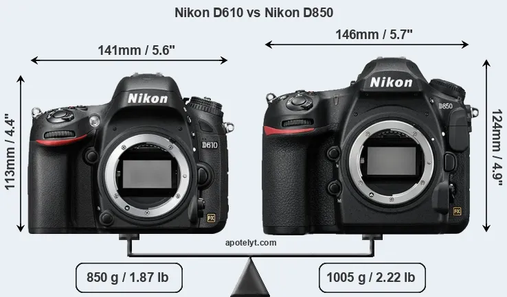 An illustration of the physical size and weight of the Nikon D610 and the Nikon D850 is provided in the side-by-side display below. The two cameras are presented according to their relative size. Three consecutive perspectives from the front, the top, and the back are available. All size dimensions are rounded to the nearest millimeter.