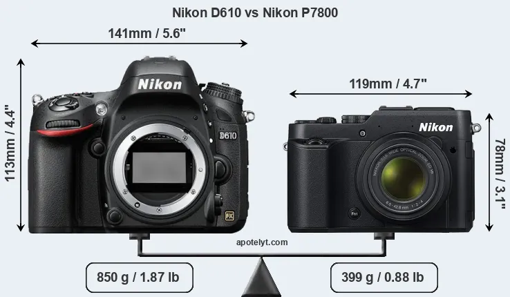 The physical size and weight of the Nikon D610 and the Nikon P7800 are illustrated in the side-by-side display below. The two cameras are presented according to their relative size. Three consecutive perspectives from the front, the top, and the back are available. All width, height and depth dimensions are rounded to the nearest millimeter.