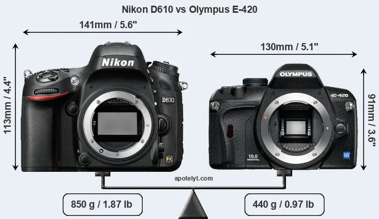 The side-by-side display below illustrates the physical size and weight of the Nikon D610 and the Olympus E-420. The two cameras are presented according to their relative size. Three consecutive views from the front, the top, and the rear side are shown. All width, height and depth dimensions are rounded to the nearest millimeter.