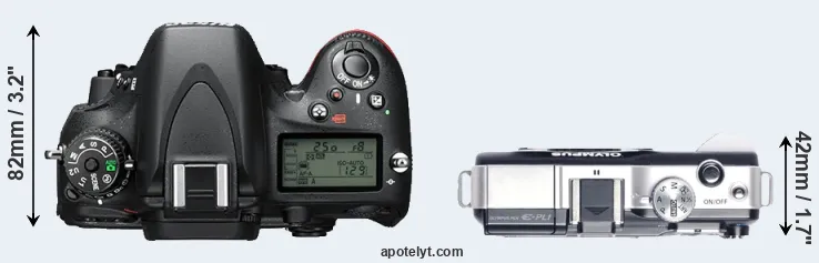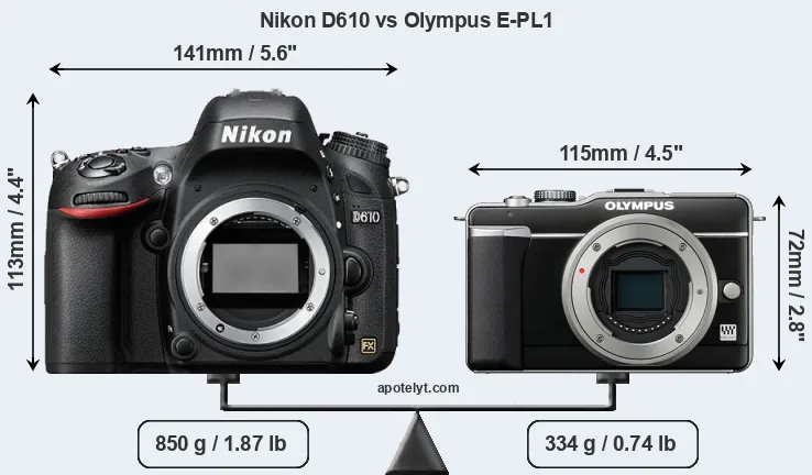 The side-by-side display below illustrates the physical size and weight of the Nikon D610 and the Olympus E-PL1. The two cameras are presented according to their relative size. Three successive views from the front, the top, and the rear are shown. All width, height and depth measures are rounded to the nearest millimeter.