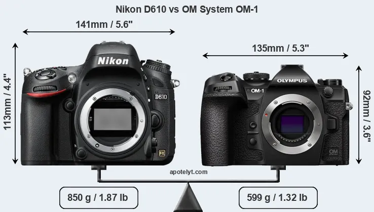 The side-by-side display below illustrates the physical size and weight of the Nikon D610 and the OM System OM-1. The two cameras are presented according to their relative size. Three consecutive views from the front, the top, and the rear side are shown. All width, height and depth measures are rounded to the nearest millimeter.