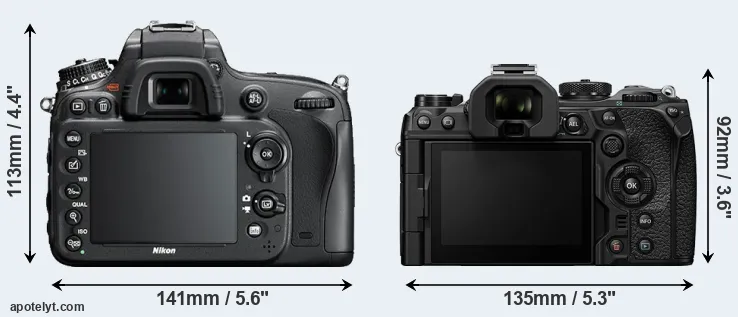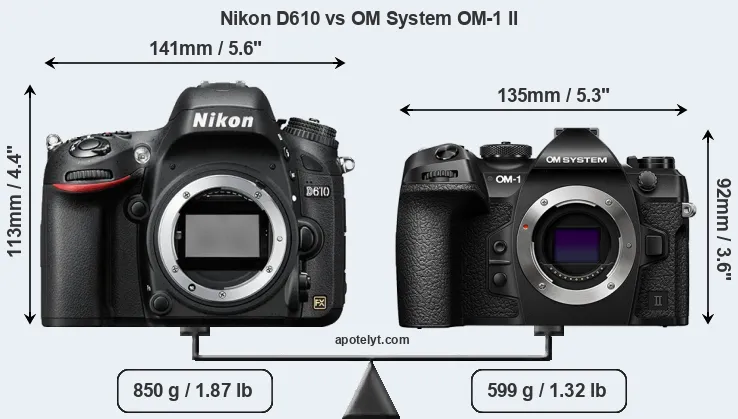 The side-by-side display below illustrates the physical size and weight of the Nikon D610 and the OM System OM-1 II. The two cameras are presented according to their relative size. Three consecutive views from the front, the top, and the rear side are shown. All width, height and depth measures are rounded to the nearest millimeter.