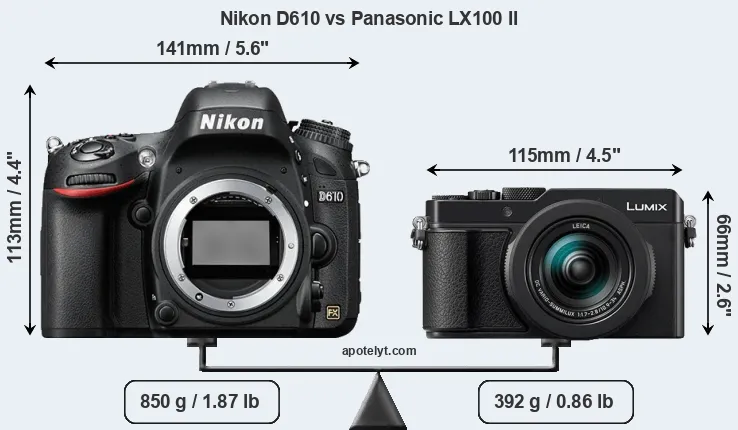 An illustration of the physical size and weight of the Nikon D610 and the Panasonic LX100 II is provided in the side-by-side display below. The two cameras are presented according to their relative size. Three consecutive views from the front, the top, and the rear side are shown. All size dimensions are rounded to the nearest millimeter.
