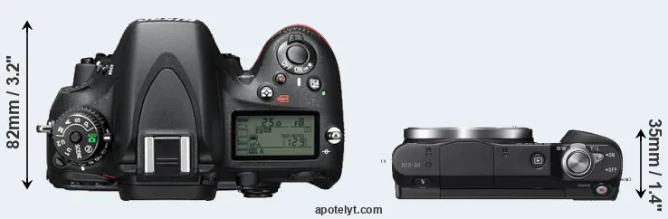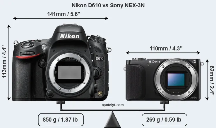The physical size and weight of the Nikon D610 and the Sony NEX-3N are illustrated in the side-by-side display below. The two cameras are presented according to their relative size. Three consecutive perspectives from the front, the top, and the back are available. All size dimensions are rounded to the nearest millimeter.
