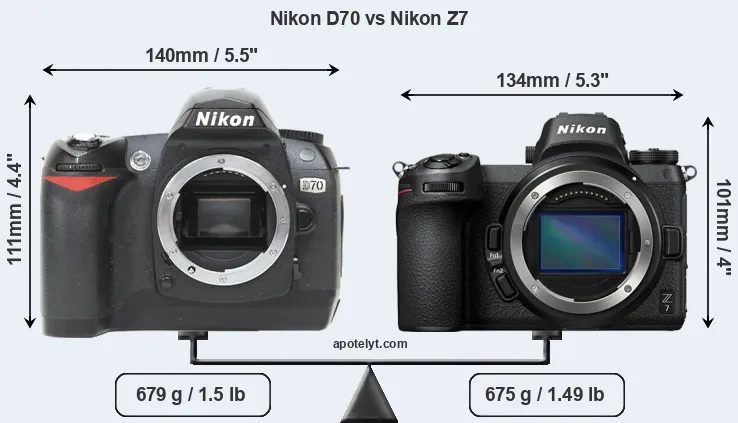 If the front view area (width x height) of the cameras is taken as an aggregate measure of their size, the Nikon Z7 is notably smaller (13 percent) than the Nikon D70. Moreover, the Z7 is slightly lighter (1 percent) than the D70. It is noteworthy in this context that the Z7 is splash and dust-proof, while the D70 does not feature any corresponding weather-sealing.
