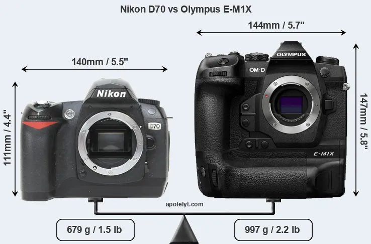 If the front view area (width x height) of the cameras is taken as an aggregate measure of their size, the Olympus E-M1X is notably larger (36 percent) than the Nikon D70. Moreover, the E-M1X is substantially heavier (47 percent) than the D70. It is noteworthy in this context that the E-M1X is splash and dust-proof, while the D70 does not feature any corresponding weather-sealing.
