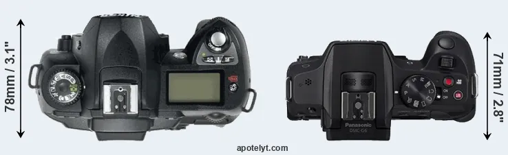The physical size and weight of the Nikon D70 and the Panasonic G6 are illustrated in the side-by-side display below. The two cameras are presented according to their relative size. Three consecutive perspectives from the front, the top, and the back are available. All size dimensions are rounded to the nearest millimeter.