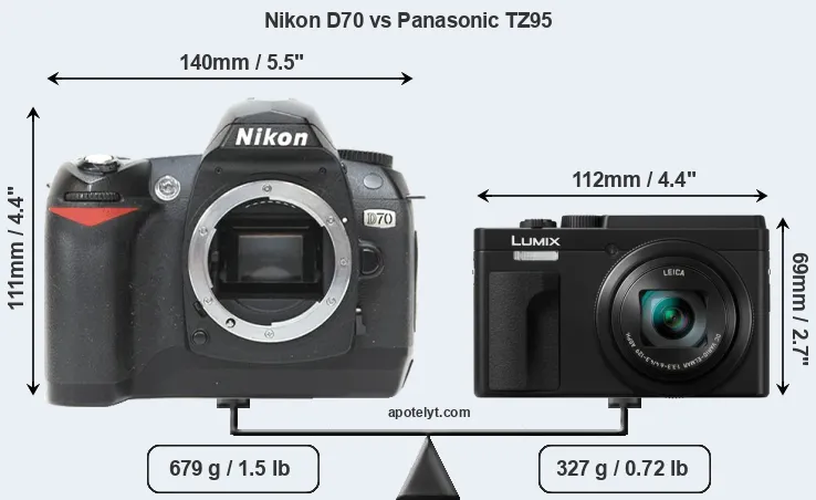 The side-by-side display below illustrates the physical size and weight of the Nikon D70 and the Panasonic TZ95. The two cameras are presented according to their relative size. Three consecutive perspectives from the front, the top, and the back are available. All size dimensions are rounded to the nearest millimeter.
