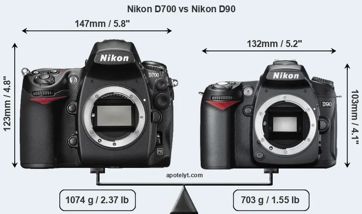 The side-by-side display below illustrates the physical size and weight of the Nikon D700 and the Nikon D90. The two cameras are presented according to their relative size. Three successive views from the front, the top, and the rear are shown. All width, height and depth dimensions are rounded to the nearest millimeter.