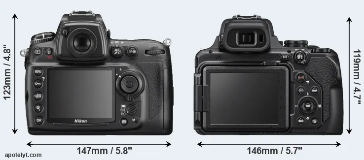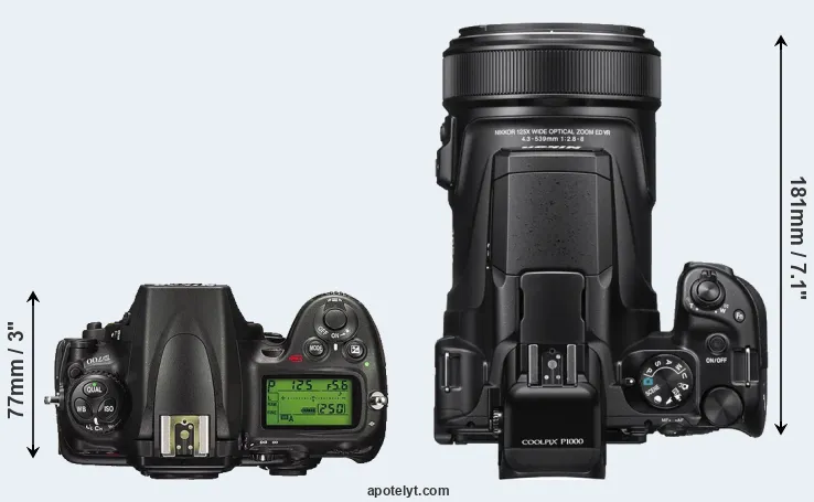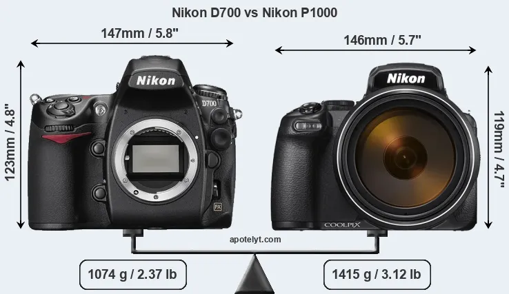 The side-by-side display below illustrates the physical size and weight of the Nikon D700 and the Nikon P1000. The two cameras are presented according to their relative size. Three consecutive perspectives from the front, the top, and the back are available. All width, height and depth measures are rounded to the nearest millimeter.