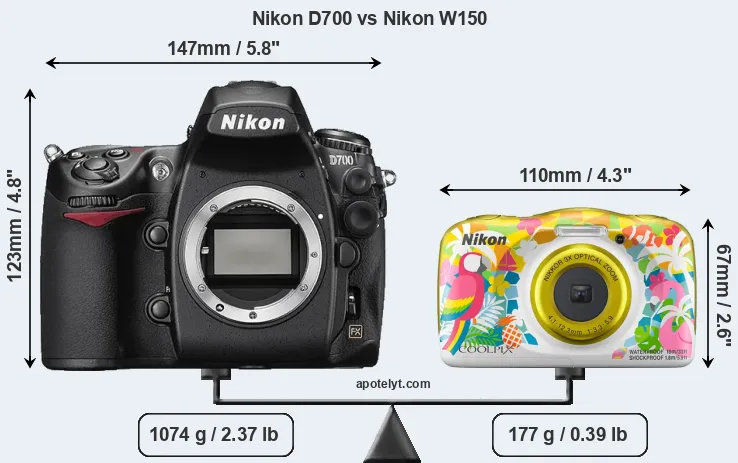 The side-by-side display below illustrates the physical size and weight of the Nikon D700 and the Nikon W150. The two cameras are presented according to their relative size. Three successive views from the front, the top, and the rear are shown. All width, height and depth measures are rounded to the nearest millimeter.