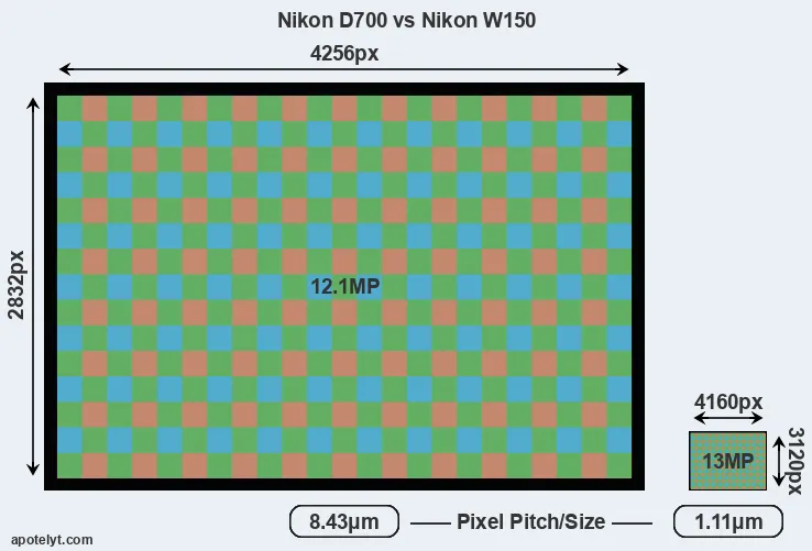 Despite having a smaller sensor, the W150 offers a slightly higher resolution of 13 megapixels, compared with 12.1 MP of the D700. This megapixels advantage comes at the cost of a higher pixel density and a smaller size of the individual pixel (with a pixel pitch of 1.11μm versus 8.43μm for the D700). However, it should be noted that the W150 is much more recent (by 10 years and 9 months) than the D700, and its sensor will have benefitted from technological advances during this time that make it possible to gather light more efficiently. Coming back to sensor resolution, it should be mentioned that the W150 has no anti-alias filter installed, so that it can capture all the detail its sensor resolves.