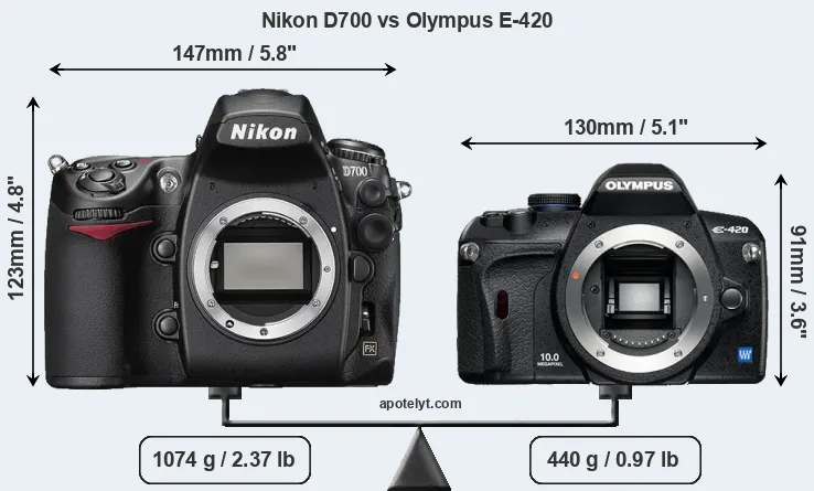The physical size and weight of the Nikon D700 and the Olympus E-420 are illustrated in the side-by-side display below. The two cameras are presented according to their relative size. Three successive views from the front, the top, and the rear are shown. All width, height and depth measures are rounded to the nearest millimeter.