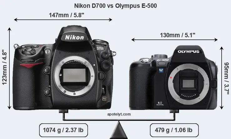 The physical size and weight of the Nikon D700 and the Olympus E-500 are illustrated in the side-by-side display below. The two cameras are presented according to their relative size. Three consecutive perspectives from the front, the top, and the back are available. All width, height and depth dimensions are rounded to the nearest millimeter.