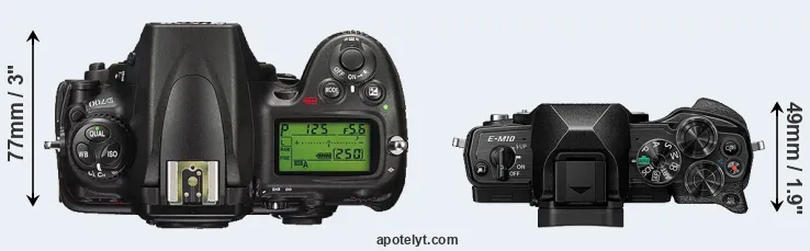 The side-by-side display below illustrates the physical size and weight of the Nikon D700 and the Olympus E-M10 IV. The two cameras are presented according to their relative size. Three consecutive views from the front, the top, and the rear side are shown. All width, height and depth measures are rounded to the nearest millimeter.