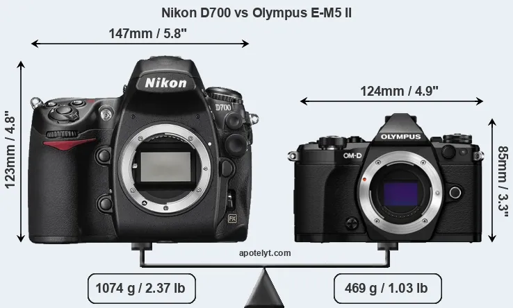 An illustration of the physical size and weight of the Nikon D700 and the Olympus E-M5 II is provided in the side-by-side display below. The two cameras are presented according to their relative size. Three consecutive views from the front, the top, and the rear side are shown. All width, height and depth measures are rounded to the nearest millimeter.