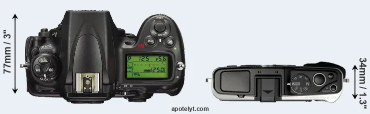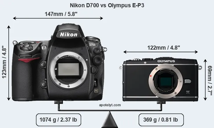 An illustration of the physical size and weight of the Nikon D700 and the Olympus E-P3 is provided in the side-by-side display below. The two cameras are presented according to their relative size. Three consecutive perspectives from the front, the top, and the back are available. All width, height and depth dimensions are rounded to the nearest millimeter.