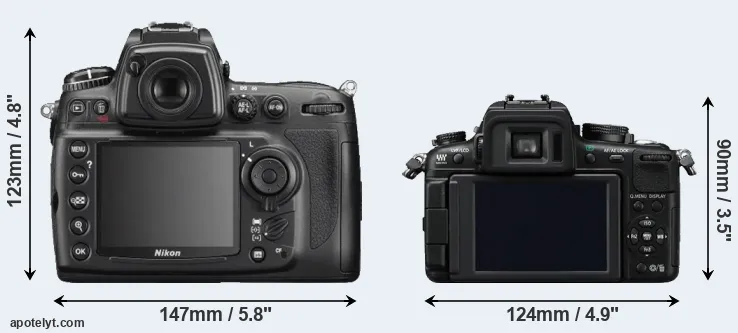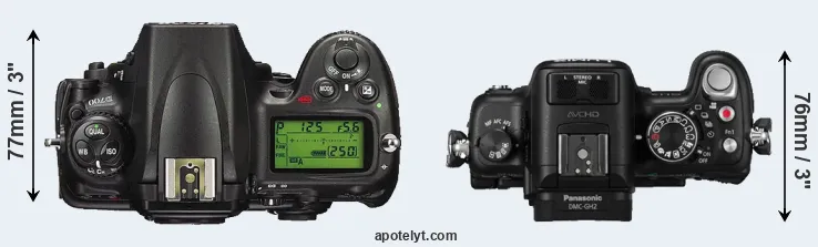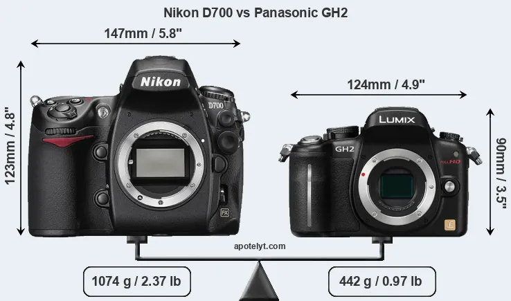 The side-by-side display below illustrates the physical size and weight of the Nikon D700 and the Panasonic GH2. The two cameras are presented according to their relative size. Three consecutive perspectives from the front, the top, and the back are available. All width, height and depth measures are rounded to the nearest millimeter.