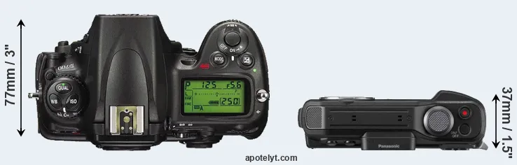 The physical size and weight of the Nikon D700 and the Panasonic TS7 are illustrated in the side-by-side display below. The two cameras are presented according to their relative size. Three successive views from the front, the top, and the rear are shown. All width, height and depth measures are rounded to the nearest millimeter.