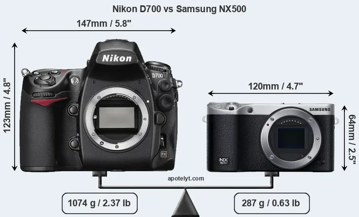 If the front view area (width x height) of the cameras is taken as an aggregate measure of their size, the Samsung NX500 is considerably smaller (58 percent) than the Nikon D700. Moreover, the NX500 is substantially lighter (73 percent) than the D700. It is worth mentioning in this context that the D700 is splash and dust resistant, while the NX500 does not feature any corresponding weather-sealing.