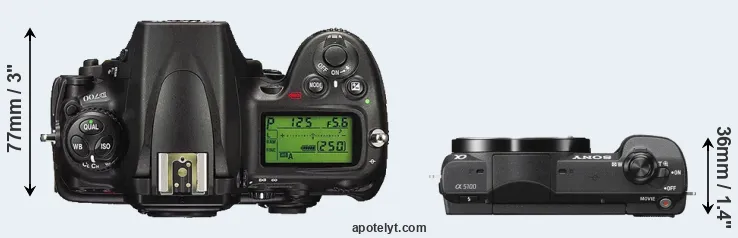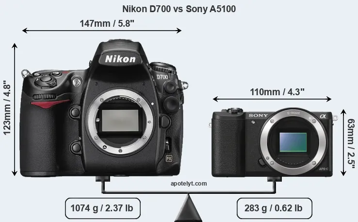 The side-by-side display below illustrates the physical size and weight of the Nikon D700 and the Sony A5100. The two cameras are presented according to their relative size. Three successive views from the front, the top, and the rear are shown. All width, height and depth dimensions are rounded to the nearest millimeter.