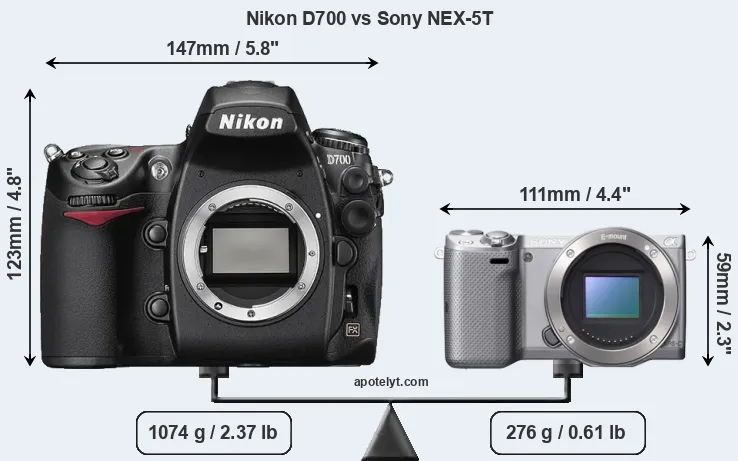 An illustration of the physical size and weight of the Nikon D700 and the Sony NEX-5T is provided in the side-by-side display below. The two cameras are presented according to their relative size. Three successive views from the front, the top, and the rear are shown. All width, height and depth dimensions are rounded to the nearest millimeter.