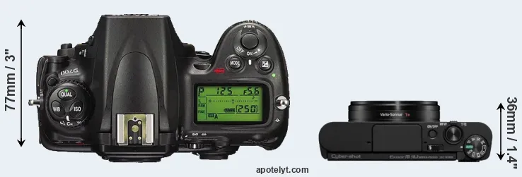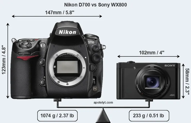 The physical size and weight of the Nikon D700 and the Sony WX800 are illustrated in the side-by-side display below. The two cameras are presented according to their relative size. Three consecutive perspectives from the front, the top, and the back are available. All width, height and depth dimensions are rounded to the nearest millimeter.
