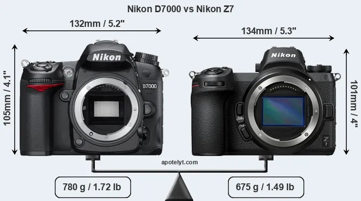 If the front view area (width x height) of the cameras is taken as an aggregate measure of their size, the Nikon Z7 is somewhat smaller (2 percent) than the Nikon D7000. Moreover, the Z7 is markedly lighter (13 percent) than the D7000. In this context, it is worth noting that both cameras are splash and dust-proof and can, hence, be used in inclement weather conditions or harsh environments.