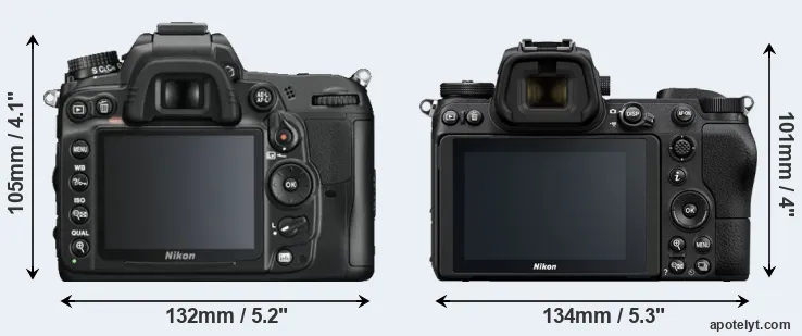 The side-by-side display below illustrates the physical size and weight of the Nikon D7000 and the Nikon Z7. The two cameras are presented according to their relative size. Three consecutive views from the front, the top, and the rear side are shown. All width, height and depth dimensions are rounded to the nearest millimeter.