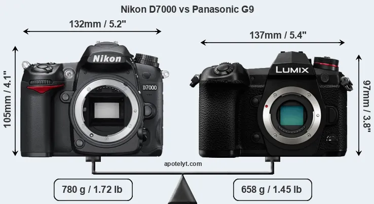 If the front view area (width x height) of the cameras is taken as an aggregate measure of their size, the Panasonic G9 is somewhat smaller (4 percent) than the Nikon D7000. Moreover, the G9 is markedly lighter (16 percent) than the D7000. In this context, it is worth noting that both cameras are splash and dust-proof and can, hence, be used in inclement weather conditions or harsh environments.