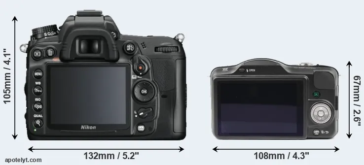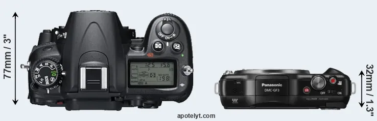 The side-by-side display below illustrates the physical size and weight of the Nikon D7000 and the Panasonic GF3. The two cameras are presented according to their relative size. Three consecutive views from the front, the top, and the rear side are shown. All width, height and depth dimensions are rounded to the nearest millimeter.