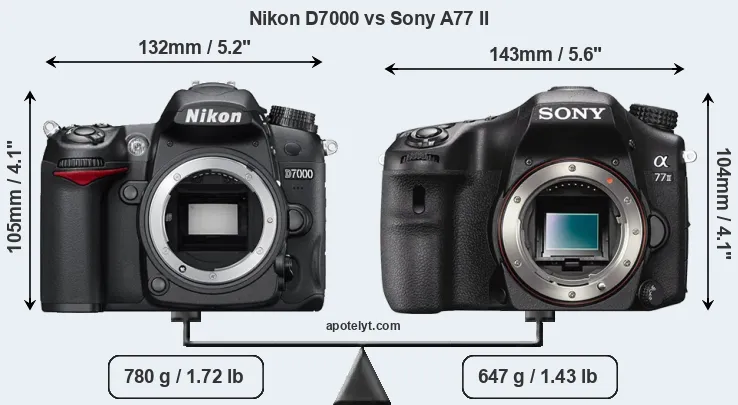 An illustration of the physical size and weight of the Nikon D7000 and the Sony A77 II is provided in the side-by-side display below. The two cameras are presented according to their relative size. Three successive views from the front, the top, and the rear are shown. All width, height and depth measures are rounded to the nearest millimeter.