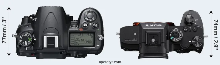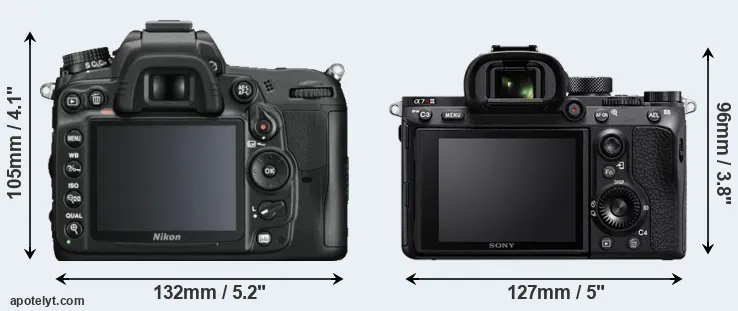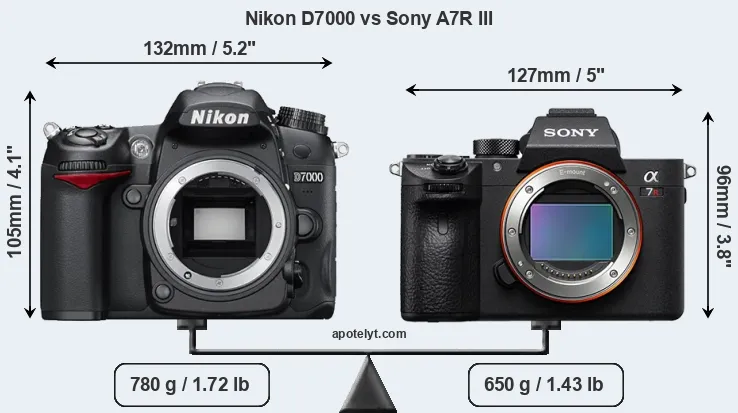 The side-by-side display below illustrates the physical size and weight of the Nikon D7000 and the Sony A7R III. The two cameras are presented according to their relative size. Three successive views from the front, the top, and the rear are shown. All width, height and depth dimensions are rounded to the nearest millimeter.
