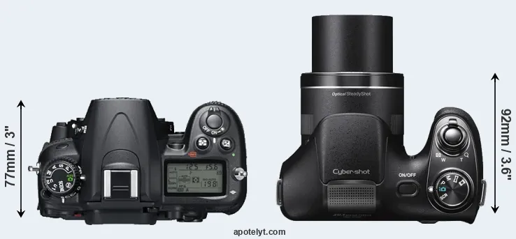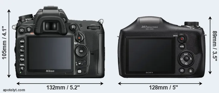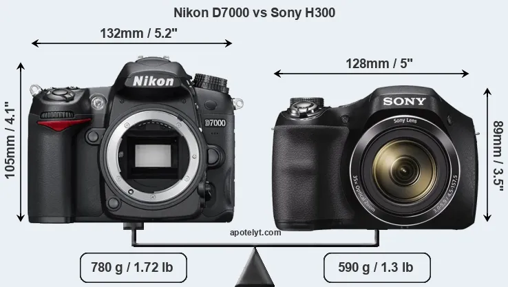 The side-by-side display below illustrates the physical size and weight of the Nikon D7000 and the Sony H300. The two cameras are presented according to their relative size. Three successive views from the front, the top, and the rear are shown. All size dimensions are rounded to the nearest millimeter.