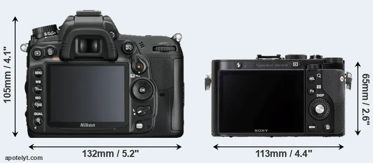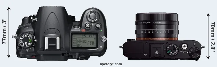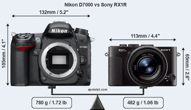 The side-by-side display below illustrates the physical size and weight of the Nikon D7000 and the Sony RX1R. The two cameras are presented according to their relative size. Three successive views from the front, the top, and the rear are shown. All size dimensions are rounded to the nearest millimeter.