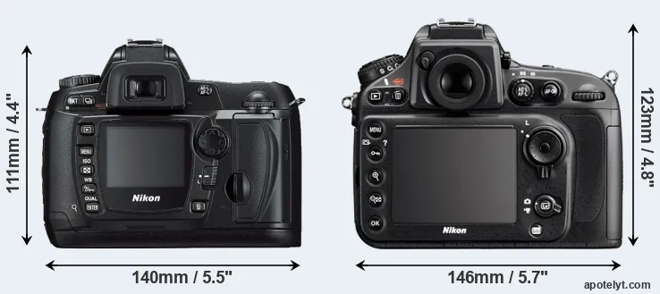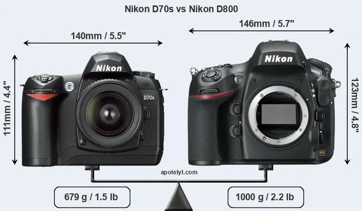 If the front view area (width x height) of the cameras is taken as an aggregate measure of their size, the Nikon D800 is notably larger (16 percent) than the Nikon D70s. Moreover, the D800 is substantially heavier (47 percent) than the D70s. It is noteworthy in this context that the D800 is splash and dust-proof, while the D70s does not feature any corresponding weather-sealing.