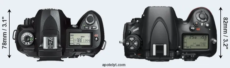 The physical size and weight of the Nikon D70s and the Nikon D800 are illustrated in the side-by-side display below. The two cameras are presented according to their relative size. Three consecutive views from the front, the top, and the rear side are shown. All width, height and depth dimensions are rounded to the nearest millimeter.
