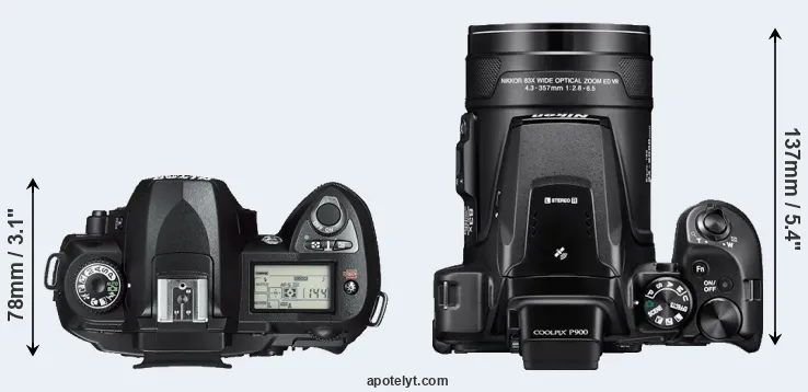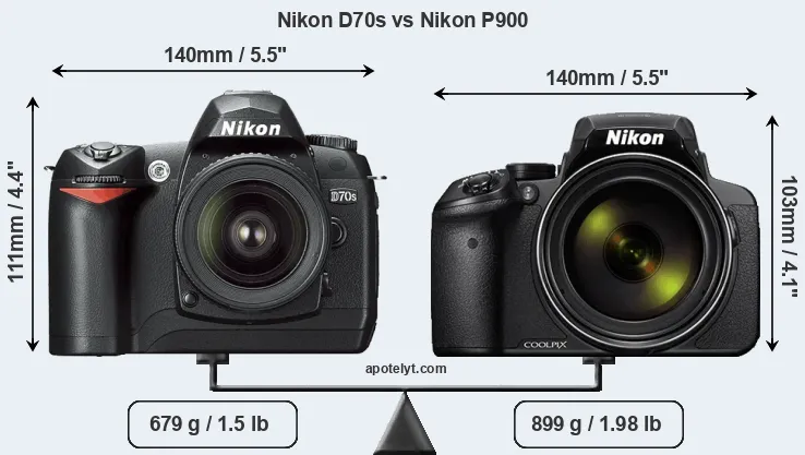 An illustration of the physical size and weight of the Nikon D70s and the Nikon P900 is provided in the side-by-side display below. The two cameras are presented according to their relative size. Three consecutive perspectives from the front, the top, and the back are available. All size dimensions are rounded to the nearest millimeter.