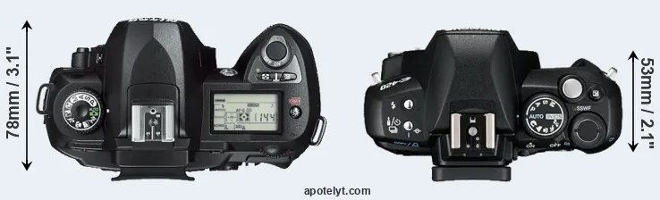 The physical size and weight of the Nikon D70s and the Olympus E-420 are illustrated in the side-by-side display below. The two cameras are presented according to their relative size. Three successive views from the front, the top, and the rear are shown. All width, height and depth measures are rounded to the nearest millimeter.